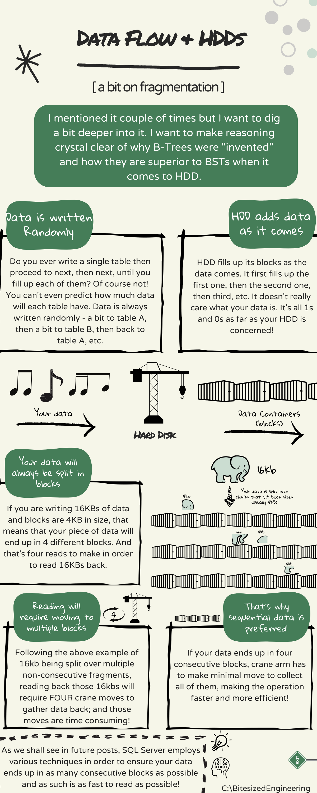 Previous article discussed how HDDs work (not SSDs but HDDs!), and in this one I want to dig a bit deeper into what HDD does with your data. All of this with the ultimate goal of showing you how your data ends up being stored, what it takes to load it and, eventually, why B-Trees ended up being invented.